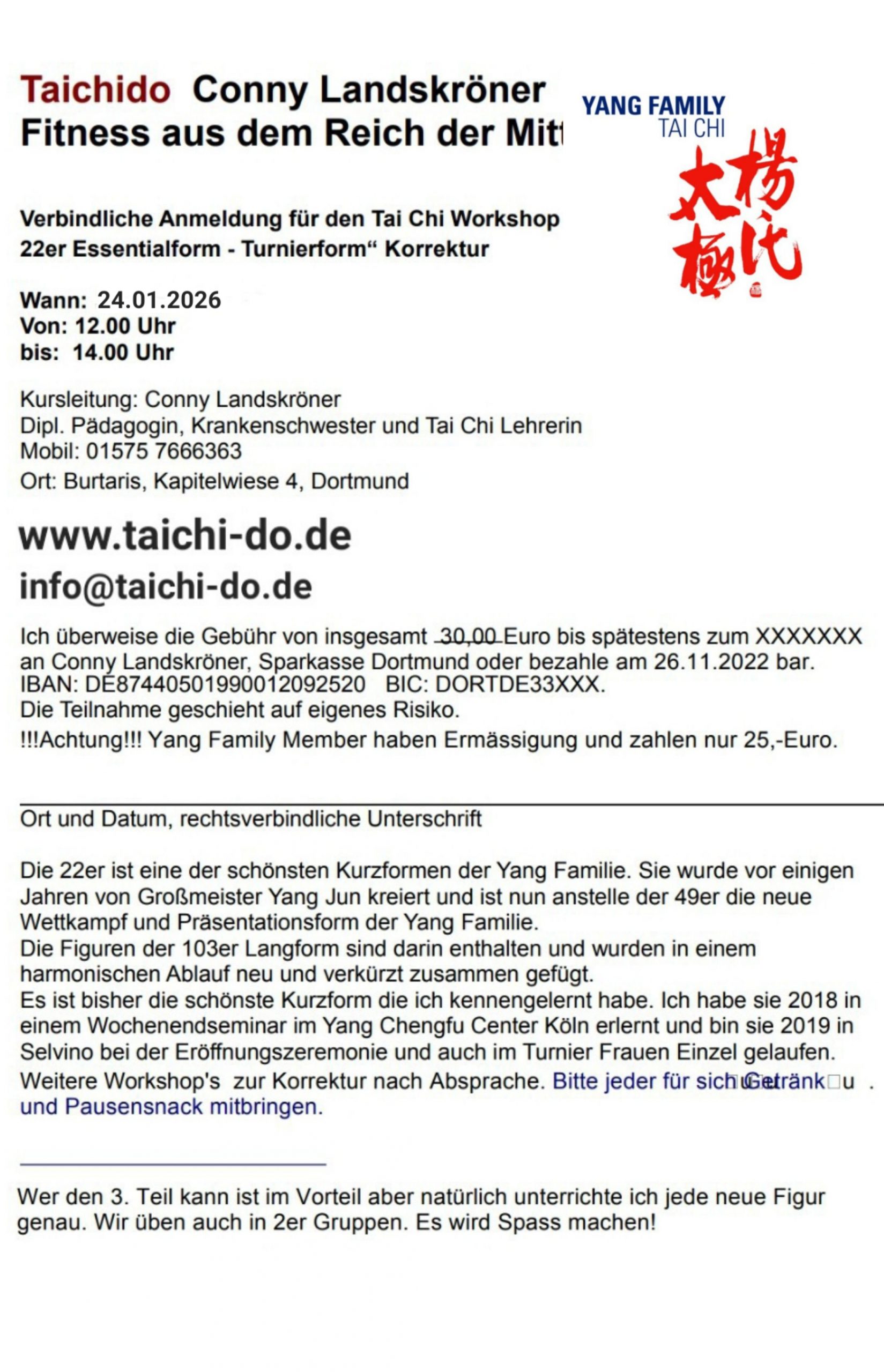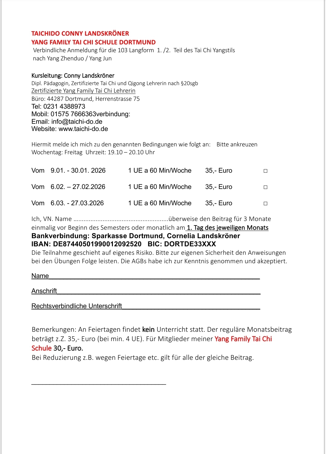 Anmeldungen sind nach Absprache möglich. Ich sende Ihnen auf Anfrage das Anmeldeformular des jeweiligen Kurses, Seminares oder Workshop’s zu. Gerne per email. Die Überweisung der Gebühren gilt ebenfalls als Anmeldung. Kontoverbindung finden Sie unter den AGB’s.
